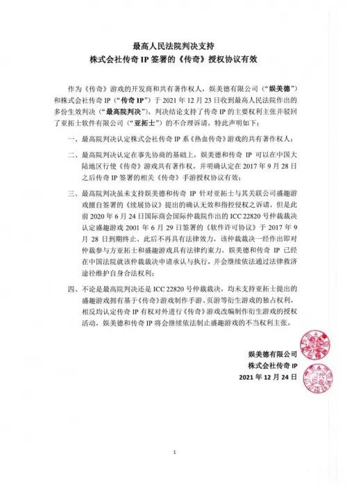 今天,记者获悉,娱美德和传奇IP于2021年12月23日收到最高人民法院作出的多份生效判决,确认娱美德和传奇IP可以在中国地区行使《传奇》游戏共有著作权,传奇IP拥有《传奇》授权权限,而盛趣游戏无权基于《传奇》游戏制作手游、页游等衍生游戏。